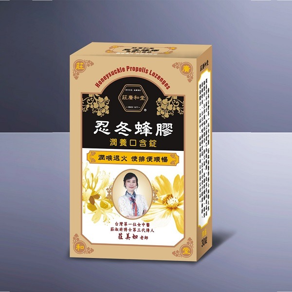 莊廣和堂 忍冬蜂膠潤養口含錠-傳承台灣第一位女中醫莊淑旂醫學博士祖傳天然潤養草本複方,加上嚴選巴西綠蜂膠,使用專利凍晶技術製作,生津潤喉好聲音、降火氣、排便順暢,讓您清新舒爽,天天呼吸新鮮空氣,是男女老少健康維持、補充體力、和病中病後補養的天然養生食品。